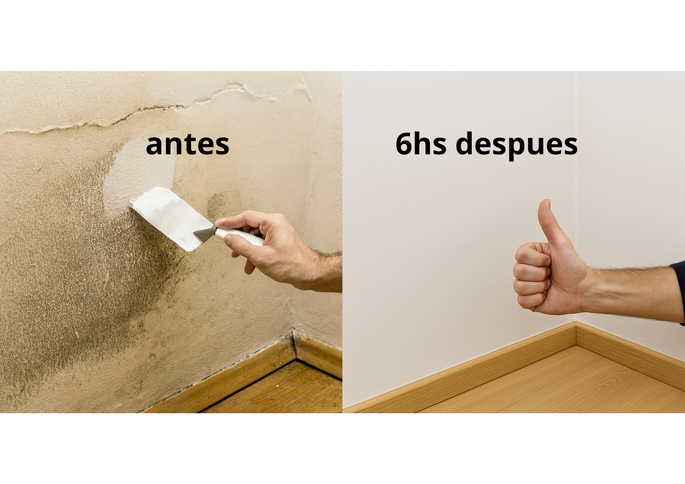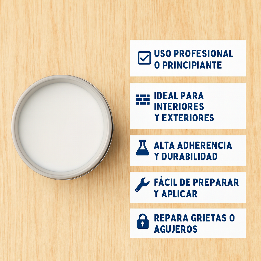 Se adhiere a yeso, cemento, madera o pintura sin despegarse, seca rápido y permite lijar y pintar en pocas horas.